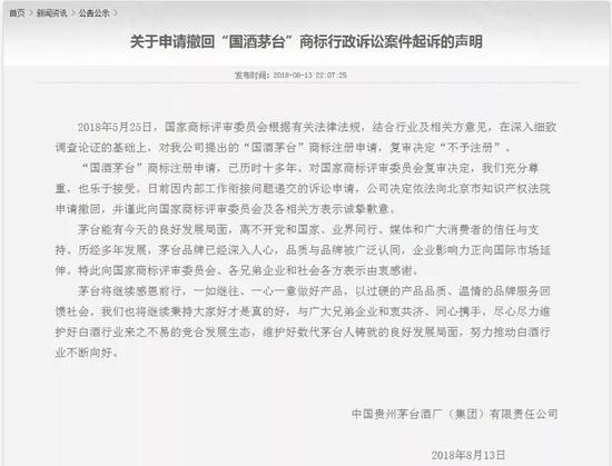 茅台在撤回声明中说,日前“因内部工作衔接问题”递交的诉讼申请,公司决定依法向北京市知识产权法院申请撤回,并谨此向国家商标评审委员会及各相关方表示诚挚歉意。