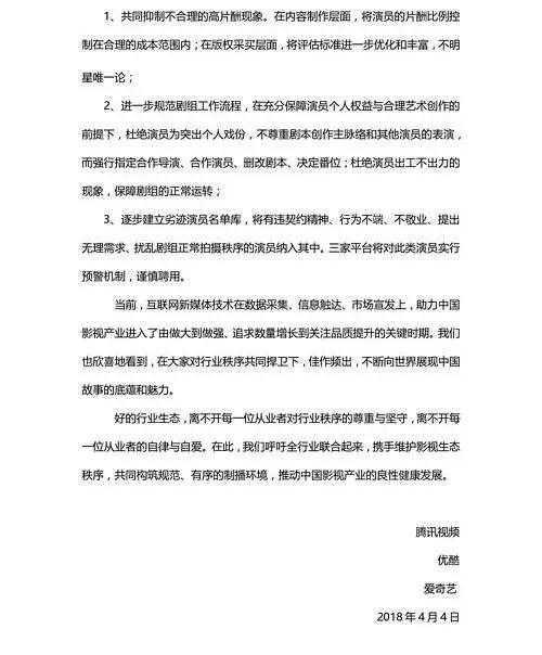 8月11日,爱奇艺、优酷、腾讯视频三家视频网站联合六大制片公司发布联合声明,共同抵制艺人“天价”片酬现象,共同抵制偷逃税、“阴阳合同”等违法行为。声明中指出,艺人单集片酬(含税)最高不得超过100万元人民币,总片酬(含税)不得超过5000万元人民币。