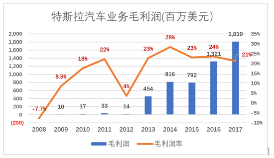 特斯拉虽然没有摆脱亏损,但近年毛利润率都在20%以上。2017年毛利润达18.1亿美元,毛利润率为21%。