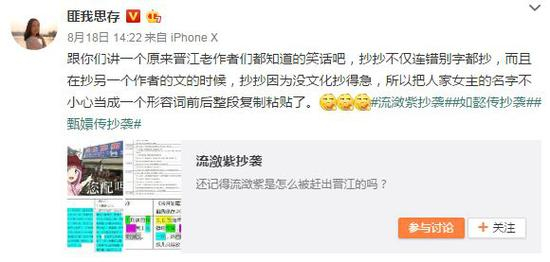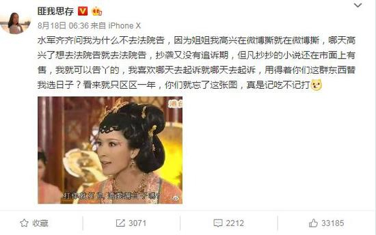 而最近匪我思存更是连发多条微博怒斥《如懿传》抄袭。随着《如懿传》确定播出,匪我思存发布微博称,“这是我最后一次不识大体”。她说成年人的任性总有极限,一年前她义无反顾揪出“流潋紫”所著的《如懿传》抄袭时,就知道这条捍卫原创的路很艰难。