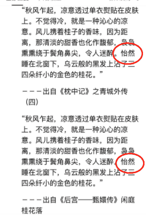 “匪我思存”在一年前曾发出截图,点出《如懿传》与自己作品中一样的部分,不少用字都出现在其中,当中一句“双鬟鸭雏色”其实是作者打错字,应该是“鬓”,没想到这个字句出现在《如懿传》时,竟然错得一模一样,“匪我思存”暗讽吐槽:“实在太巧了啊。”