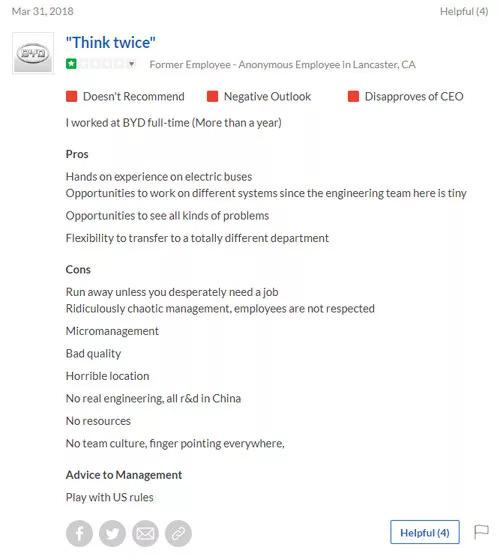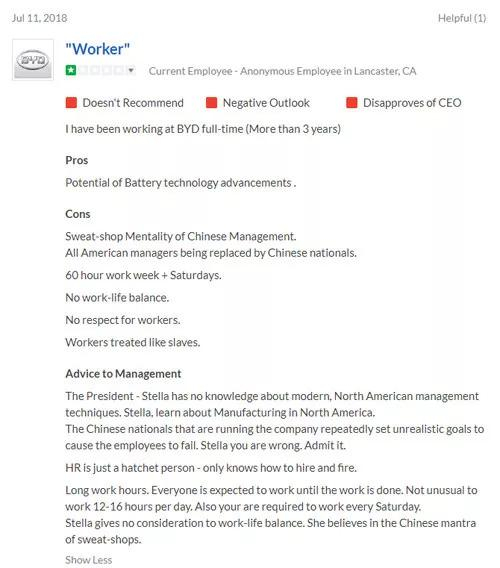 · 当年在兴办兰卡斯特工厂时,比亚迪曾许诺,会为当地创造2000个就业岗位。但直到2018年5月,他们所雇佣的人员都没有超过1000人。不仅如此,比亚迪还经常被工人权利组织指责,原因包括未能给工人提供能保障基本其基本生活的工资,以及在执行健康和安全条例方面违反雇佣法要求等等。在美国雇主评级网站Glassdoor.com上,比亚迪的评分是2.2分(满分5分);评述内容多为员工对公司的各种抱怨,言辞颇为激烈。就比如下面这个: