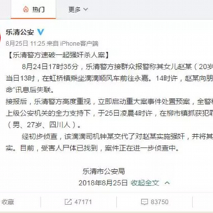 8月25日,乐清市公安局发布警情通报称,8月24日17时35分,乐清警方接群众报警称其女儿赵某(20岁、乐清人)于当日13时,在虹桥镇乘坐滴滴顺风车前往永嘉。14时许,赵某向朋友发送“救命”讯息后失联。接报后,乐清警方高度重视,于25日凌晨4时许,在柳市镇抓获犯罪嫌疑人钟某(男、27岁、四川人)。经初步侦查,该滴滴司机钟某交代了对赵某实施强奸并将其杀害的犯罪事实。