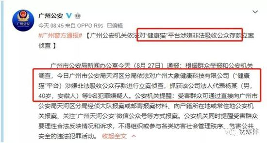 昨日早上(8月27日),广州市公安局新闻办公室发布通报:“根据群众举报和公安机关调查,今日广州市公安局天河区分局依法对广州大象健康科技有限公司(“健康猫”平台)涉嫌非法吸收公众存款进行立案侦查,抓获该公司法人代表杨某(男,40岁,安徽人)等9名犯罪嫌疑人。”