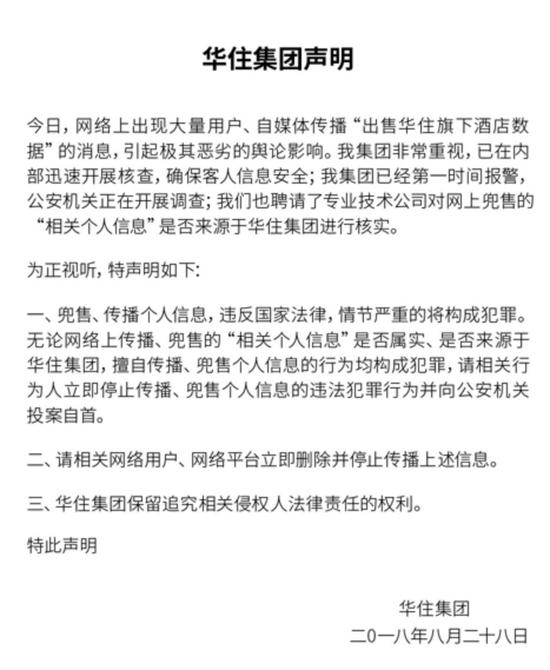 华住集团官方向《财经》记者回应称,已经收到了网上所有信息,并已经报警,并聘请专业技术公司对网上兜售的“相关个人信息是否属实”进行核实,有进展将随时公之于众。