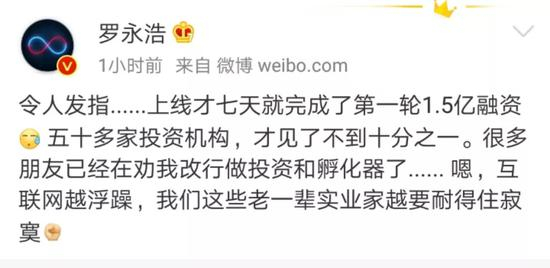8月27日,他在微博里炫耀了子弹短信的融资进展:短短6天,51家VC,7家科技巨头(中国一共有几家“科技巨头”?)的战略投资部……8月28日,他又在微博里确认了融资细节:令人发指......上线才七天就完成了第一轮1.5亿融资,五十多家投资机构,才见了不到十分之一.....