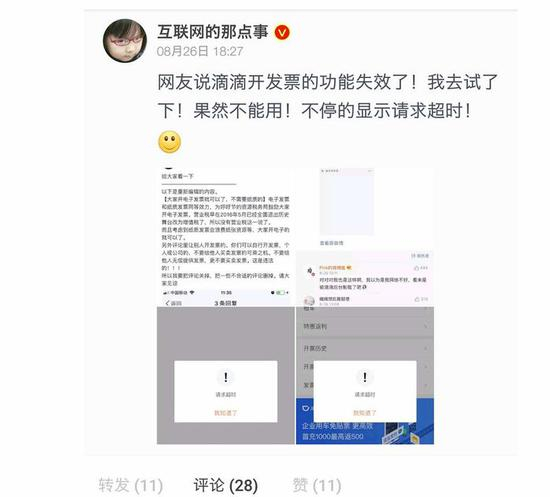 8月26日,有微博大V发微博称按照原有路径申请发票的方法失效了。 申请开发票的时候,不停地显示请求超时,并附上了相关操作截图。