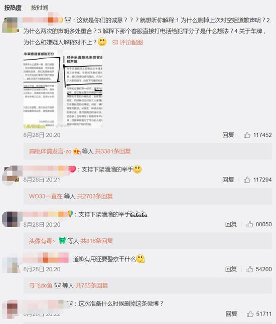 在滴滴出行官方微博发布的道歉声明下面,许多网友依然难以平复,支持下架滴滴的留言被11万个赞顶上热门。