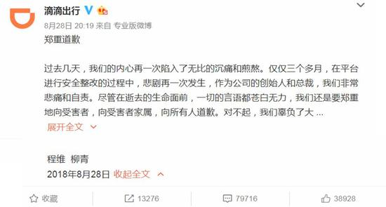“在逝去的生命面前,一切言语都苍白无力。”这是“滴滴出行”官方微信及微博在8月28日晚进行“郑重道歉”时发出的声音。该篇“郑重道歉”文章的署名作者为“程维 柳青”,前者是滴滴出行创始人、董事长兼CEO,后者是滴滴出行总裁。