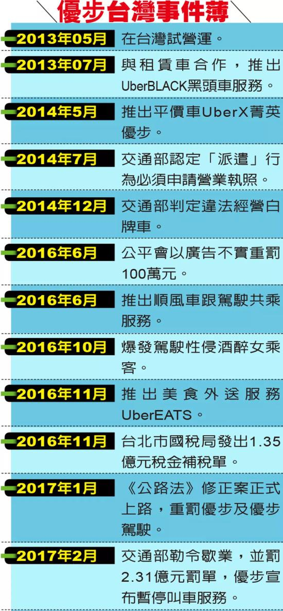 2013年,Uber进入台湾,以私家车提供载客服务,并招募一般驾驶员,因触犯了台湾“不纳保、不纳税、不纳管”的法令底线,又因发生司机性侵乘客事件被台湾当局重罚。