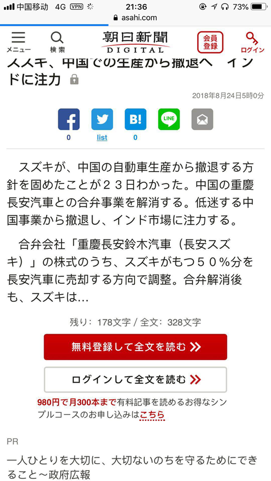 铃木退出中国的消息,源自日本《朝日新闻》,8月24日,日本《朝日新闻》发布消息,大致意思为:铃木决定退出停滞不前的中国业务,专注于印度市场。在合资企业重庆长安铃木汽车的股份中,已将铃木50%的股份调整为长安汽车,即使在取消合资企业后,铃木也将与长安汽车签署许可协议,暂时生产标有铃木的乘用车。中国降低了汽车关税后,有继续出口销售的可能性。”