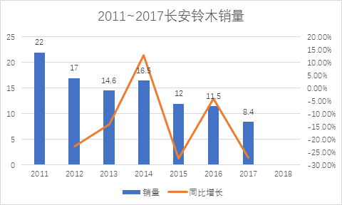 数据显示,2017年长安铃木在华销量为8.4万辆,同比下滑27%,而2011年是长安铃木销量最高的年份,这一年销量高达22万辆,如今年销量不及最高时的一半,可以说是“节节败退”.