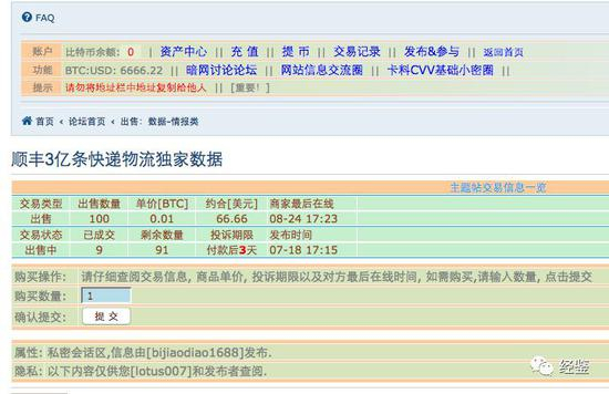 登录信息显示,这位“bijiaodiao1688”的暗网用户,注册于2018年7月11日。“顺丰3亿条快递物流独家数据”帖文发布于2018年7月18日,交易采用比特币进行交易。信息记录显示,发布者最后在线时间为8月24日17时23分。