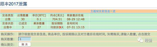 据报价,上述2000万条数据售价为0.5比特币(约合3500美元),购买者可支付0.1比特币(约704美元)验货。截至8月29日,该暗网用户已经完成3笔验货成交。按数据量级推算,最多有1200万条疑似顺丰数据流入市场。