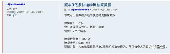 据发布者披露,这里的3亿条数据包括顺丰快递物流中,寄件人、收件人的姓名、地址、电话等个人信息,交易可以选择先“验货”,验货数据量10万条,验货费用0.01个比特币。