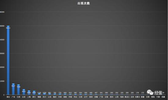 通过数据分析,《经鉴》 对省级地址进行了归类。分析发现,湖北省出现的次数最多,次数达到50011次;广东省次之,出现的次数达到8117次;江苏省以7446次排名第三。
