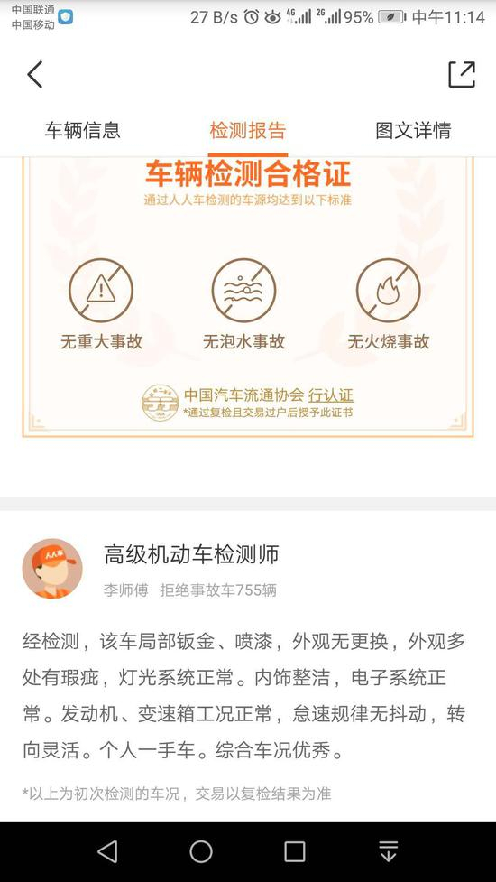 此外,人人车平台以“高级机动车检测师李师傅”的名义标明:“经检测,该车局部钣金、喷漆,外观无更换,外观多处有瑕疵,灯光系统正常。内饰整洁,电子系统正常。发动机、变速箱工况正常,怠速规律无抖动,转向灵活。个人一手车。综合车况优秀。”(以上为初次检测的车况,交易以复检结果为准)