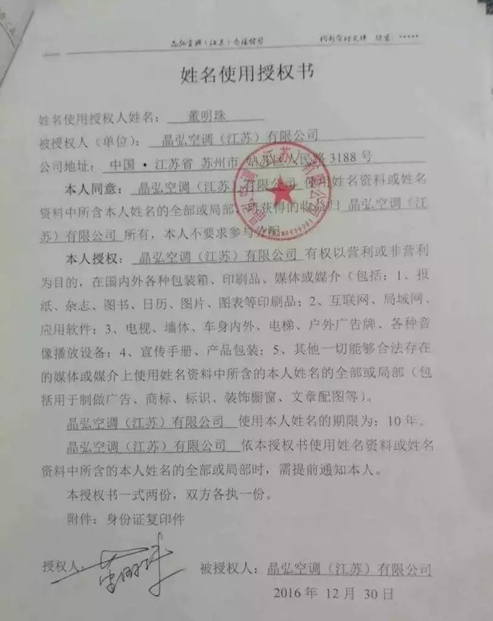 一纸姓名使用授权书似乎揭示了这位“董明珠”的来头。转转某“REE弘立”空调卖家将一份文件发布在产品介绍页面,文件显示,一位名叫“董明珠”的人,将其姓名授权给晶弘空调(江苏)有限公司使用,所带来的收益归公司所有,“董明珠”不参与分配。这份文件的签署时间是2016年12月30日,有效期为10年,并盖有晶弘空调(江苏)有限公司的公章。经AI财经社比对,“董明珠”的手写签名与格力董事长董明珠的签名显然不同。