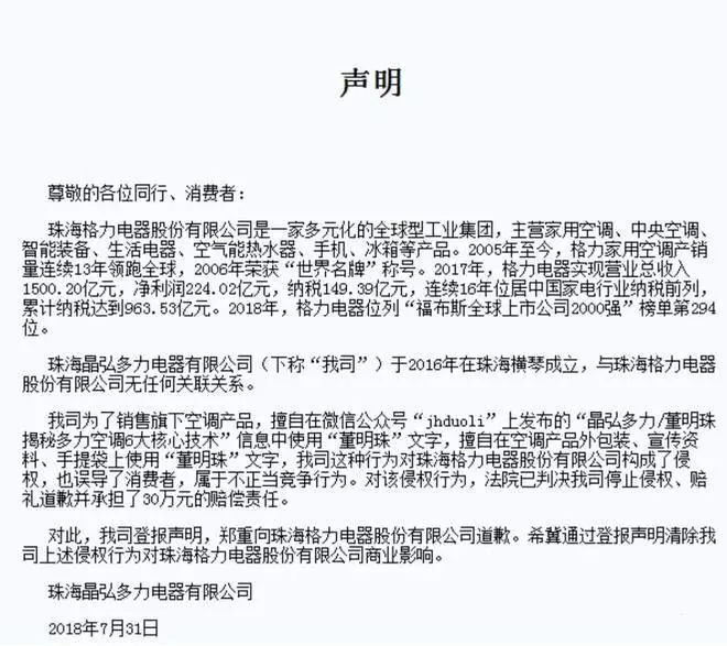 这家电器公司即珠海晶弘多力电器有限公司,2018年7月31日,该公司在报纸上刊登对格力电器的公开道歉。据《每日经济新闻》报道,2016年10月,珠海晶弘多力与一位名叫“董明珠”的人签订协议,后者成为晶弘多力形象代言人。晶弘多力在自家产空调的各类宣传中,使用“董明珠”作为宣传噱头。