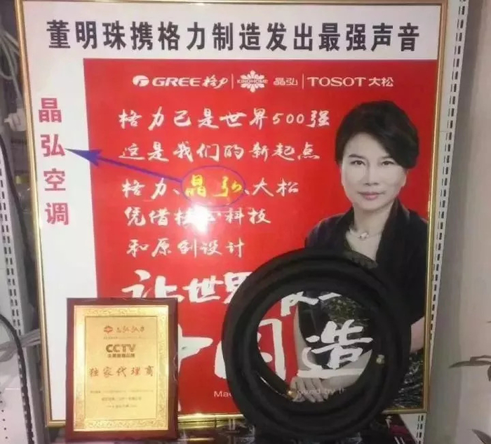 2018年3月,一位新疆网友发现他所在的城市有家名为晶弘弘力的空调厂商,正在招商并销售晶弘弘力空调。店内张贴着印有董明珠照片的宣传板,空调外包装箱体上则写着“董明珠监制”,非常醒目。