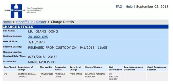 记录显示,一名叫Liu,Qiangdong的男子,的确在8月31日的时候被明尼苏达警方逮捕,但很快被释放了。