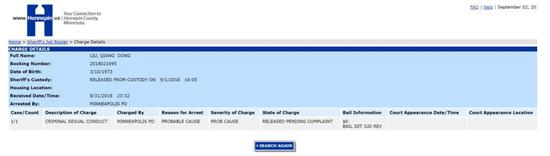 这些信息源来自于明尼阿波利斯所在的亨内平县(Hennepin County)治安官网站。9月2日,外媒报道称,京东集团创始人兼首席执行官刘强东因涉嫌“构成犯罪的性行为”(criminal sexual conduct)于当地时间8月31日晚间在明尼苏达州被逮捕,9月1日下午被释放。