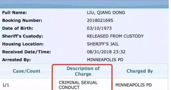 美国明尼苏达州监狱信息显示,当地时间8月31日,明尼苏达州明尼阿波利斯市警方逮捕了京东董事局主席刘强东,控诉罪名为性侵犯罪(criminal sexual conduct)。16个小时后,他被保释出狱,状态为“释放等待控告”(released pending complaint)。