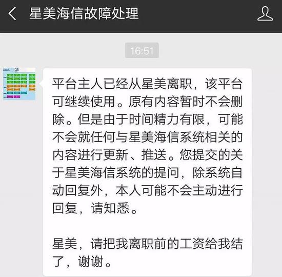 比网友留言更绝的是,目前公号的运营人员已离职,并撂下了“讨薪”声明。9月1日,该公号已更名为“星美请发我工资。”