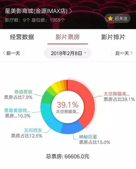 “星美因为欠院线分账款,很多新电影都被停了秘钥。解决方案是买断大量老电影,出假票房。不止是票房差的三四线城市造假,连最好的北京金源店都造假。”杨枭给小娱看了张截图,2018年2月8号,星美北京金源IMAX店,当日票房66606元,其中2016年的片子《太空熊猫英雄归来》贡献了近40%的业绩,力压《神秘巨星》、《勇敢者游戏》等新片。
