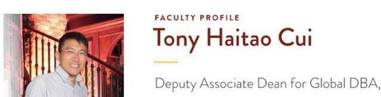 根据学院官网,崔海涛2000年从清华大学 IMBA 毕业。之后来到美国宾州大学进修。2005年博士毕业后加入卡尔森学院。现在为 DBA 项目的助理副主任。
