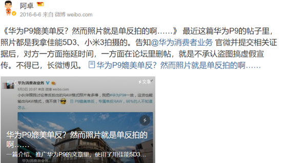 面对质疑,华为事后也做出了道歉,删除了照片。并且给出了说明:谈到此张照片确非P9拍摄,其也并非有意模糊误导用户,分享照片,也只是为了激发用户灵感“。