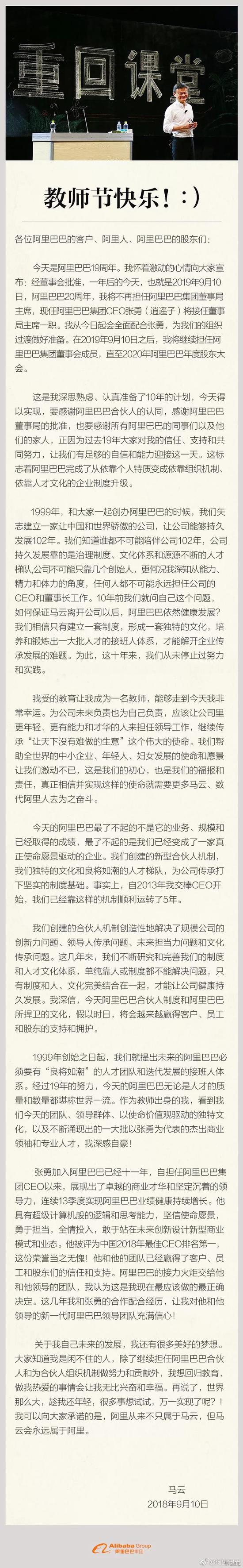 下图为马云9月10日教师节公开信全文: