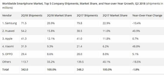 市场研究公司IDC今年8月发布的数据显示,华为在2018年第二季度的出货量首次超过苹果,市场份额位居全球第二,达到15.8%。