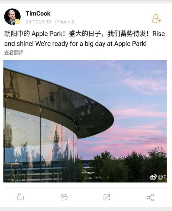 为了照顾国内用户观看发布会的需要,苹果今年专门联合了腾讯视频及爱奇艺提供直播渠道,并配备同声传译及中文字幕。发布会开始前,库克还专门在微博上预热:“朝阳中Apple Park!盛大的日子,我们蓄势待发!”