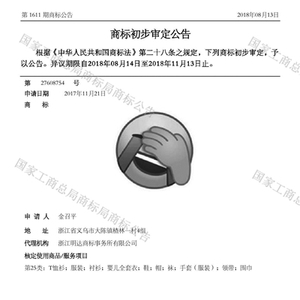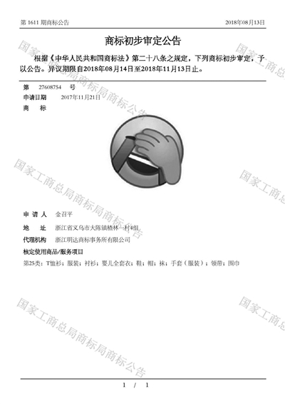 该商标申请人金召平告诉记者,他经营一家服饰公司,公司平时会设计和生产各种服饰,“捂脸表情”是他公司下面的设计团队为搭配服饰而设计出来的。“这个表情我们已经用了一两年,平时就是印在T恤、裤子等服饰上面。”