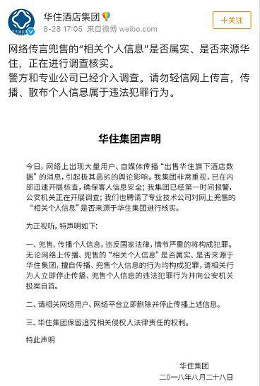 事件发生后,华住方面于同日下午在官方微博中发布声明。声明表示已在内部展开核查并第一时间报警,警方和专业公司随即介入调查。2小时后华住再次强调,网络传言兜售的“相关个人信息”是否属实、是否来源于华住,正在进行调查核实。