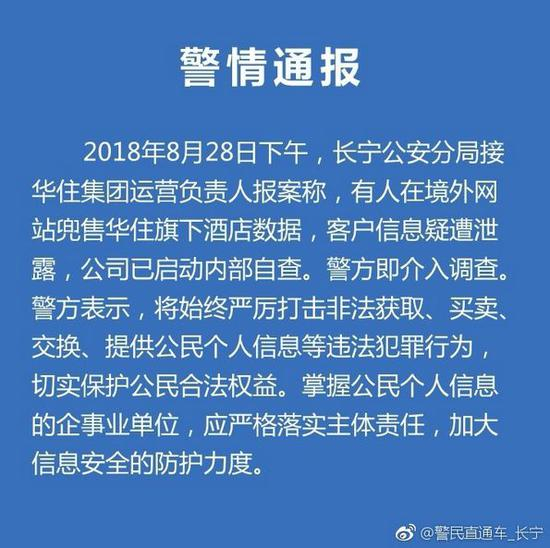 8月28日晚间7时,上海市公安局长宁分局发布警情通报称,当日下午接华住集团运营负责人报案警方即介入调查。警方提醒,掌握公民个人信息的企事业单位,应严格落实主体责任,加大信息安全的防护力度。
