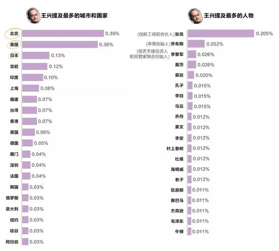 从王兴最常提及的人物中,可以看到王兴的兴趣广博:乔布斯、盖茨、李白、孔子、海明威都是他饭否状态中的高频词。“如果没有苹果,没有iPhone,就没有移动互联网,今天所有这一切都不可能实现。”在9月20日香港上市现场,王兴还特别提到了苹果公司创始人乔布斯,并表示了感谢。王兴的世界观和他感兴趣的国家和地区是另一个观察他的角度。“2018年是向世界输出商业模式的开始,”在2018年2月发布的内部信中,王兴这样表示,而从他密集提及的城市和国家里,或许能看出美团海外市场的下一步。