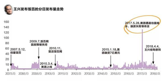 在另一条王兴的饭否日发布量走势上,能看到在公司发展的关键节点上他发布饭否的频率并不高。不过,这张趋势图里有一个奇怪的高点,即2017年5月28日。