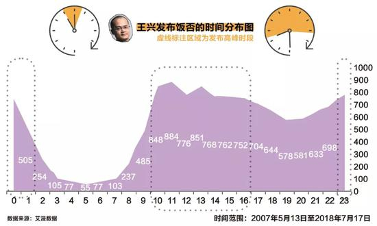从王兴超过13000条状态里,可以发现他发布饭否的高峰时段:上午10点到16点、晚间23点到1点。早晨十点是他发布饭否的高峰,中午12点出现下降,午后1点是另一个他喜欢发布状态的时间,以一己之力打破了“老板很忙”的幻象。晚上11点到2点,则是他的另一个发布状态高峰。