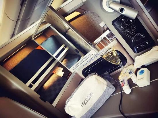 上图中除了洗漱袋你还可以发现贴心的配备了一瓶小矿,这细微的用心之处让小编十分感动(但是回程航班登机时,这里空空如也,直到关灯睡觉的时候,空姐才每人发了一瓶小矿。估计是怕乘客半夜没水喝频繁按铃?)