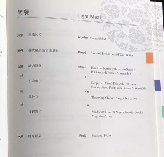 落地之前,空姐又来点简餐,直接翻开了橘黄色的那一页,我很纳闷呢,橘黄色不是10月菜单吗?现在就有了?毫不犹豫点了三杯鸡。