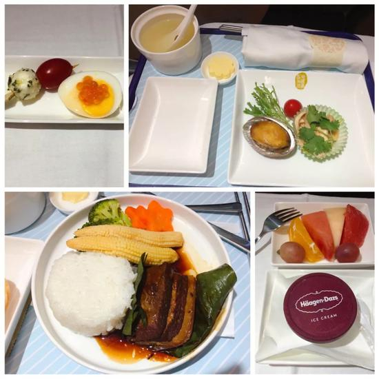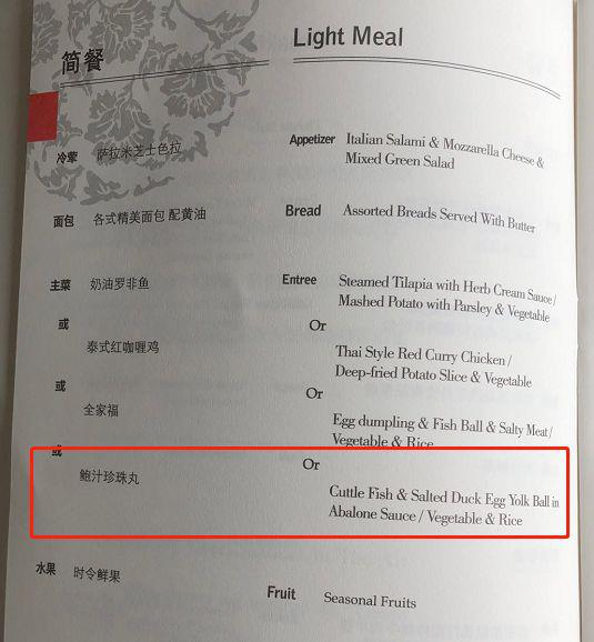 结果还是我太天真,过了十几分钟空姐跑回来说要点红色的,这回终于点到9月套餐了。小编因为刚才正餐没有吃到辽参,所以点个同为海鲜类的鲍汁珍珠丸尝尝。