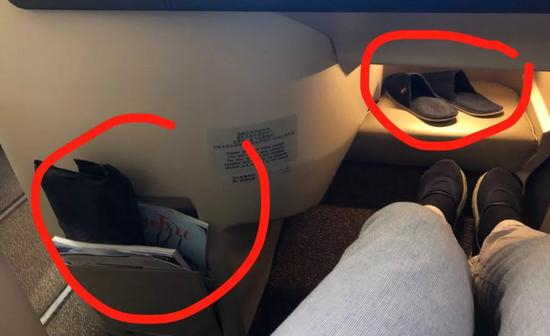 上边这些是一些细节上的问题,那么下边这个卫生问题则让人感觉非常不舒服。登机后我发现我的坐位放脚的地方有一双拖鞋,心想MU现在这么贴心?居然还提前把拖鞋拿出来摆好?等等……那边上插在那的没打开的拖鞋是给谁的?原来曾经在飞新航时候经历的遇上“脏坐位”(期望越大,失望越大的五星新航)的一幕又发生了!