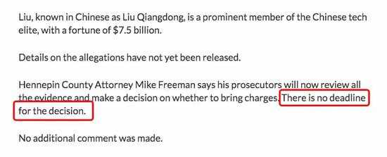 亨内平县检察官Mike Freeman称,警方已经完成了对刘强东性侵指控的初步调查,现在检方将决定是否起诉,但是做这个决定的时间没有最后期限。