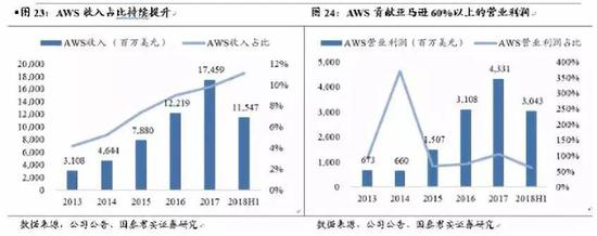 2018第二季度亚马逊在全球公有云市场份额保持在34%,超过排名第2-5名竞争者市场份额之和。AWS用11%的收入贡献了60%的营业利润,帮助亚马逊开启了新的盈利方向,为万亿市值提供了足够的引爆点。