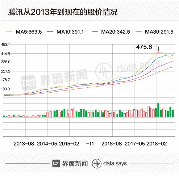 2017年11月是腾讯股价飙升的又一个里程碑。当月,腾讯所投资的阅文集团、搜狗、易鑫集团三家公司陆续在香港和美国上市,这为腾讯带来了充足的财务回报。各种消息刺激下,腾讯股价在当月突破400港元,并在2018年2月达到了历史最高值每股475港元。