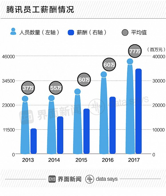 随之增长的还有人均薪酬。腾讯的人均年薪酬从2013年的37万元增长到了77万元,增长率为108%。
