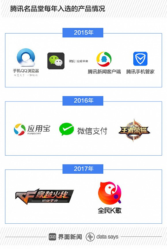 以腾讯的这几年的名品堂为例,2015年,手机QQ浏览器 、微信公众平台、腾讯新闻客户端、腾讯手机管家4款产品登上了殿堂。到了2017年,则只有2款产品,穿越火线手游和全民K歌。