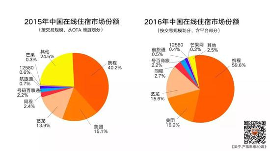 就在携程一统天下的时候,美团的份额从2015年的15.1%到2016年的16.2%,份额并没有下降,也在用自己的速度增长。美团也在2016年打胜了外卖这个大仗,整体流量又进一步。新用户的进入,让美团酒店也受益了。